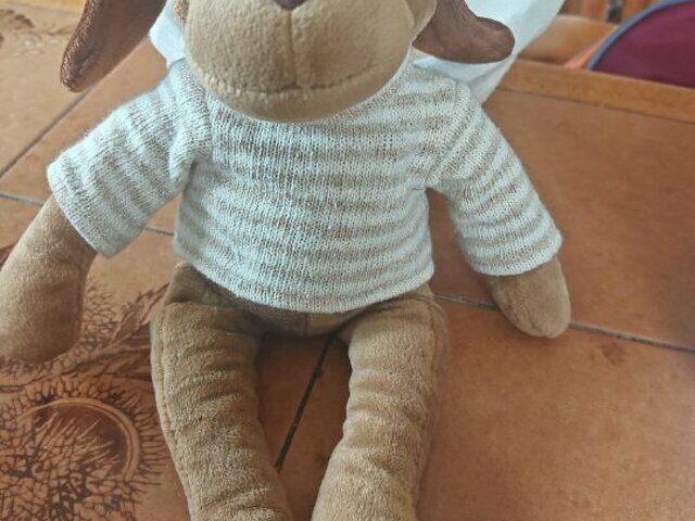 Je recherche pour mon petit fils une peluche chien de la marque nounours avec un pull à rayures bleues. Perdu. Je sais qu'il existe le même avec un pull rayé beige. L'un ou l'autre serait le bienvenu pour mon petit fils de 5 ans. Merci