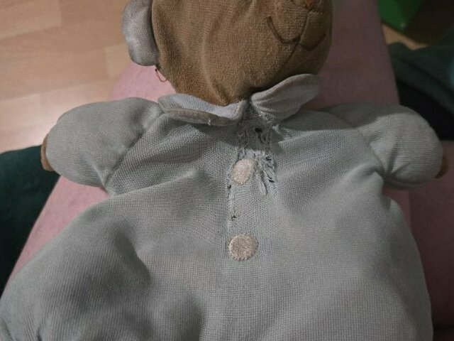 Bonjour, je cherche mon doudou en bon état. Il n’y a pas de marque. C’est un ours marron avec une grenouillère vert/bleu avec un bonnet bointu. Il possède une clochette dans son ventre. Et on ne voit qu’une oreille sortir du bonnet. Je l’ai eu y’a 22 ans mais peut être qu’il est plus vieux. J’ai une photo actuelle s’il faut.