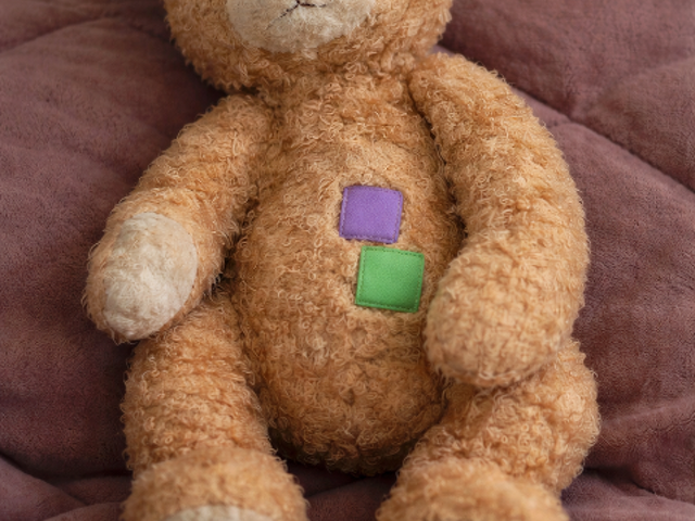Sa particularité très importante : il avait deux petits carrés cousus, un violet et un vert, en matière différente plus lisse (comme du fil ou un tissu fin).