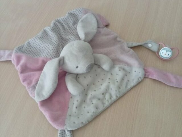 Doudou Carré avec une tête de lapin en relief au milieu, couleur : blanc et rose, avec des pois et des étoiles sur le tissu blanc. Une tétine est accrochée dessus.